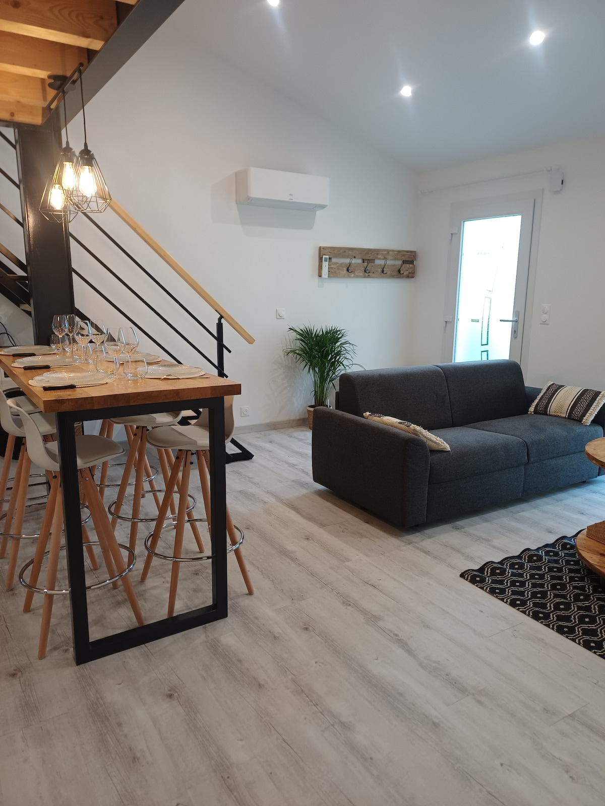 Logement neuf rénové avec goût, maison très bien équipée, terrain clos, grande terrasse avec pergola idéale pour profiter de la piscine. A proximité de toutes commodités Capacité d'accueil pour 2 pers. (possibilité d'accueillir 1 enfant en plus grâce au canapé-lit). La maison comprend une cuisine équipée ouverte sur le salon avec réfrigérateur, congélateur, micro-ondes, four, lave-vaisselle et plaque à induction. Dressing, lit de 160 cm, salle de bain avec douche, toilettes , lave linge