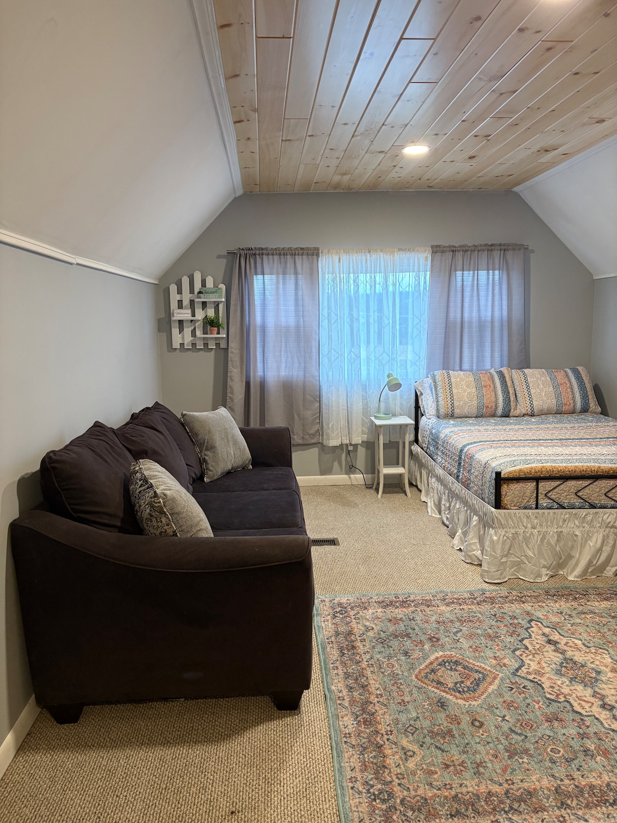 Une chambre confortable et douillette d'un côté d'un duplex avec tout le nécessaire et rien de superflu. Lit king size ? C'est fait. Canapé convertible ? Oui. Cuisine pour les céréales ou les gourmets (nous ne jugeons pas), coin bureau pour le « travail » et une salle de bain fraîche avec un nouveau robinet et des toilettes. Parking dans le garage, allée partagée, buanderie au sous-sol. Pas chic, mais bien plus agréable que ce à quoi on s'attend. Parfait pour se reposer, se doucher et se ressourcer.