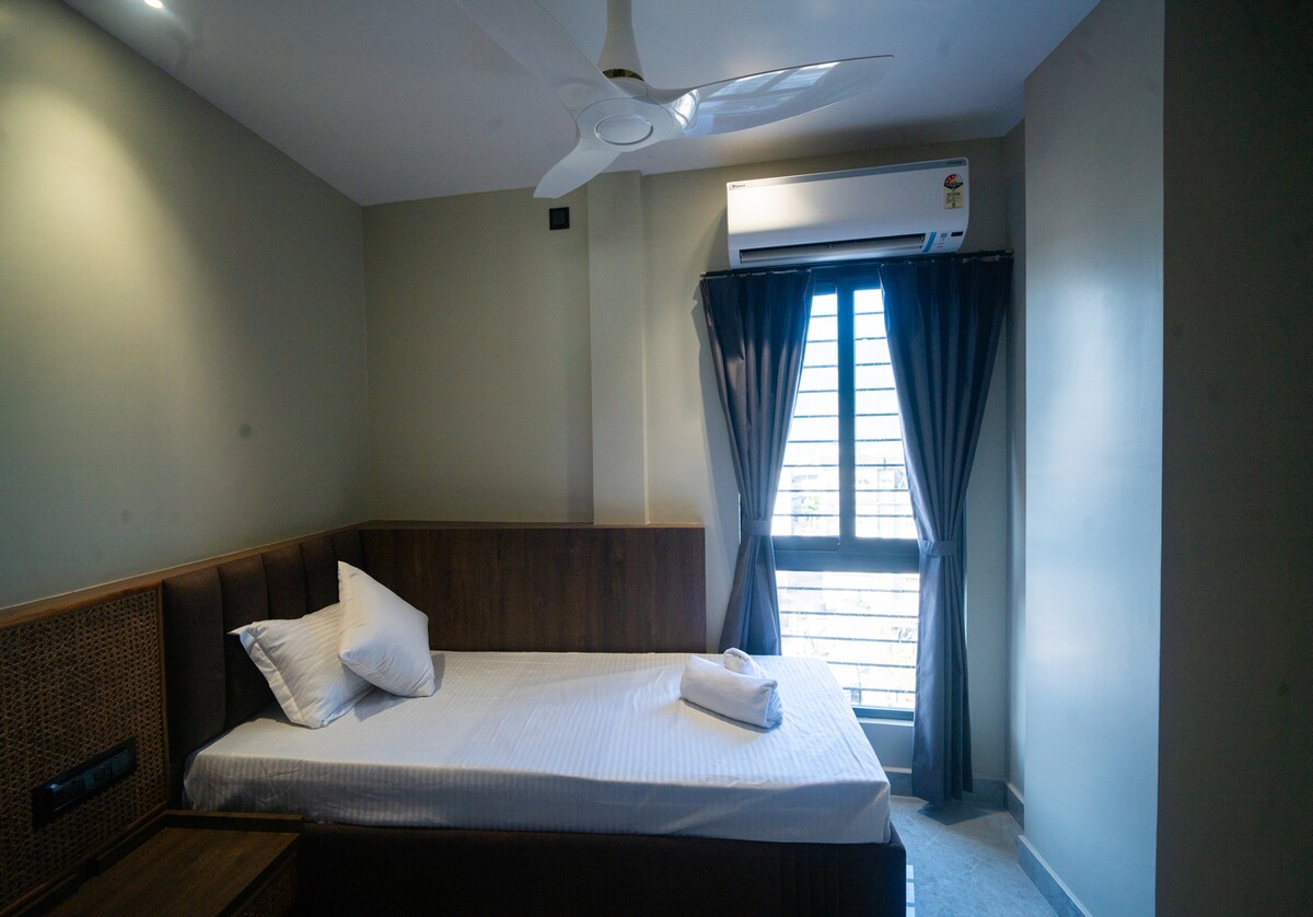 This stylish place to stay is perfect for group trips. Experience a peaceful stay in our spacious 200 sq ft AC room featuring a comfortable king-size bed, large LED TV, and two private balconies with fresh forest air. Enjoy an attached premium bathroom with a pressure pump, geyser, and separate dry area for convenience. Perfect for couples and families, this room offers comfort, privacy, and a homely feel inside our warm and welcoming homestay.
