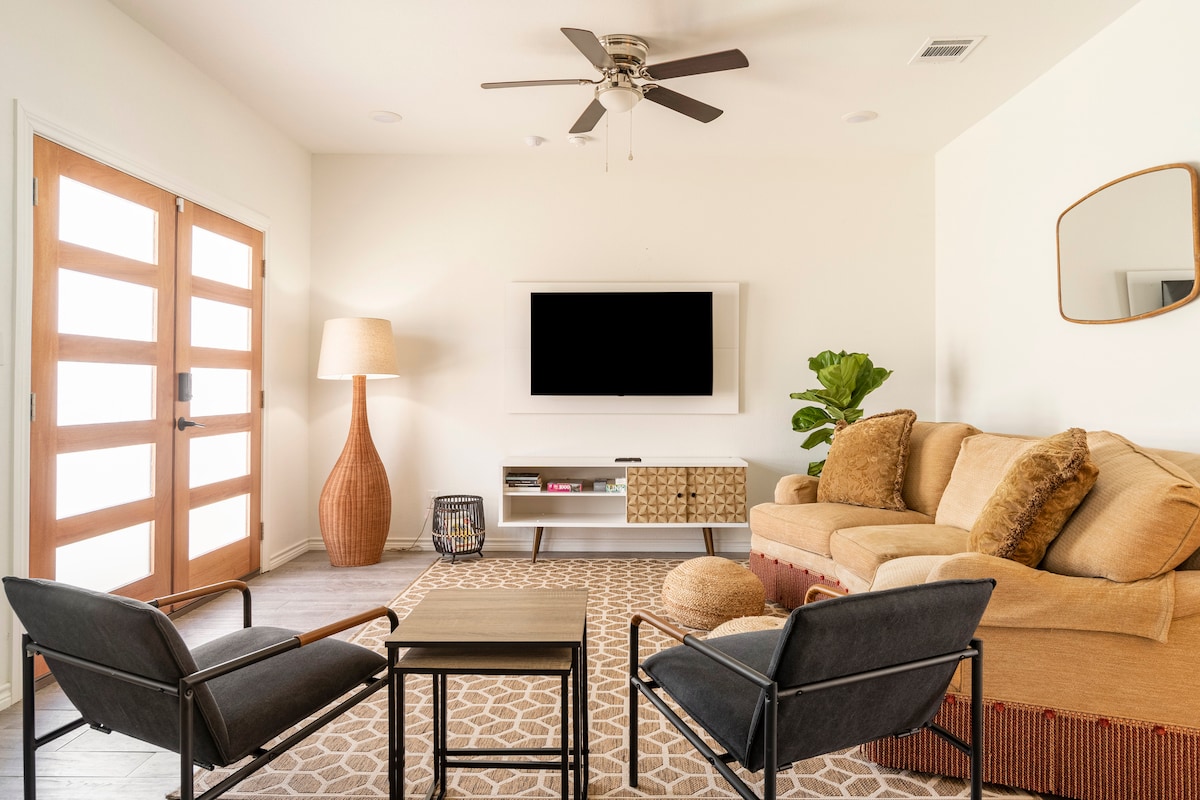 Bienvenue à la Dignowity Dreamhouse située au cœur de San Antonio. Notre maison a été construite en 2019 et bénéficie d'un design de ferme de luxe moderne. Le plan d'étage ouvert est idéal pour recevoir et l'emplacement est central à tout ce que San Antonio a à offrir. Prenez 5 minutes en voiture pour vous rendre au River Walk, au Pearl, à Southtown, à l'Alamodome, à la Tour des Amériques, au centre SBC et bien plus encore. Il n'y a pas un détail qui n'ait pas été pris en compte et nous espérons que vous aimerez notre maison autant que nous !