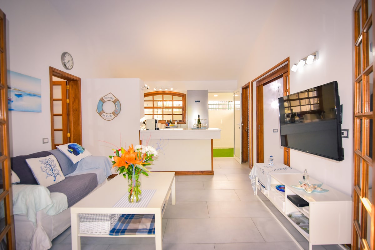 TropicalBlue is a pleasant villa in an excellent location situated at 2 minutes walking distance to Meloneras beach and an easy 20 minute walk along the promenade to the main beach in Maspolomas. Next to golf course and Masplomas broadwalk full of leasure activities. Complex has large swimming pool, kids pool & jacuzzi. TropicalBlue can accommodate up to 4 guests with two bedrooms at the second floor. You will find a beautiful garden to just chill, sunbathing as well as enjoy dinners outside.