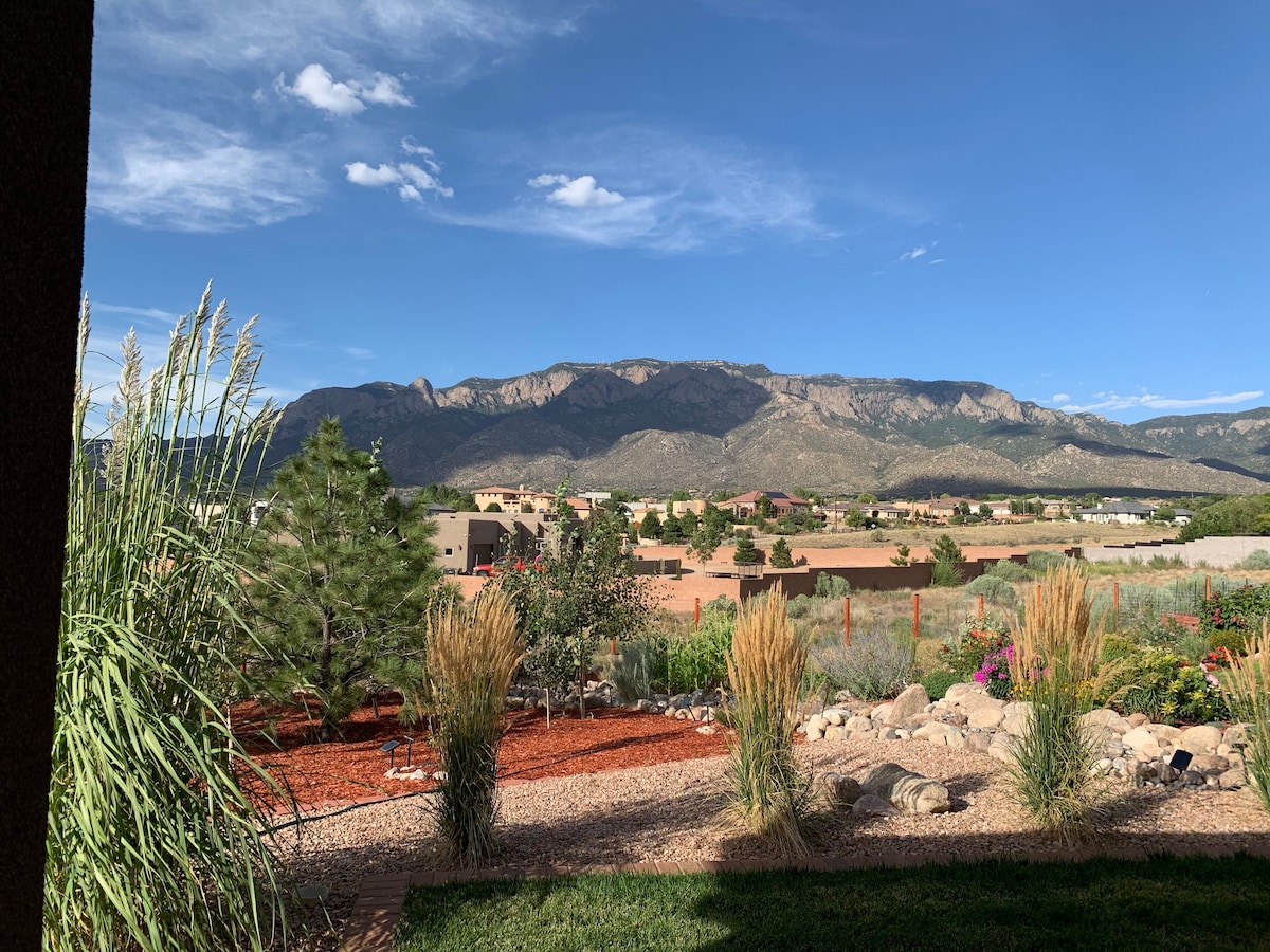 Une suite d'hôtes Southwest entièrement privée (sans cuisine) avec une vue imprenable, un coin café, une piscine, un spa, un foyer extérieur et un barbecue, le tout sur un terrain entièrement clôturé. Votre aile de 2 étages entièrement privée avec entrée séparée comprend 2 chambres et une salle de bain complète en bas. À l'étage, il y a une grande pièce ouverte avec cheminée, canapé-lit et grande terrasse avec vue sur ABQ en contrebas. Un mur insonorisé sépare la suite privée de la maison principale avec un parking sécurisé à l'intérieur de la propriété clôturée.
