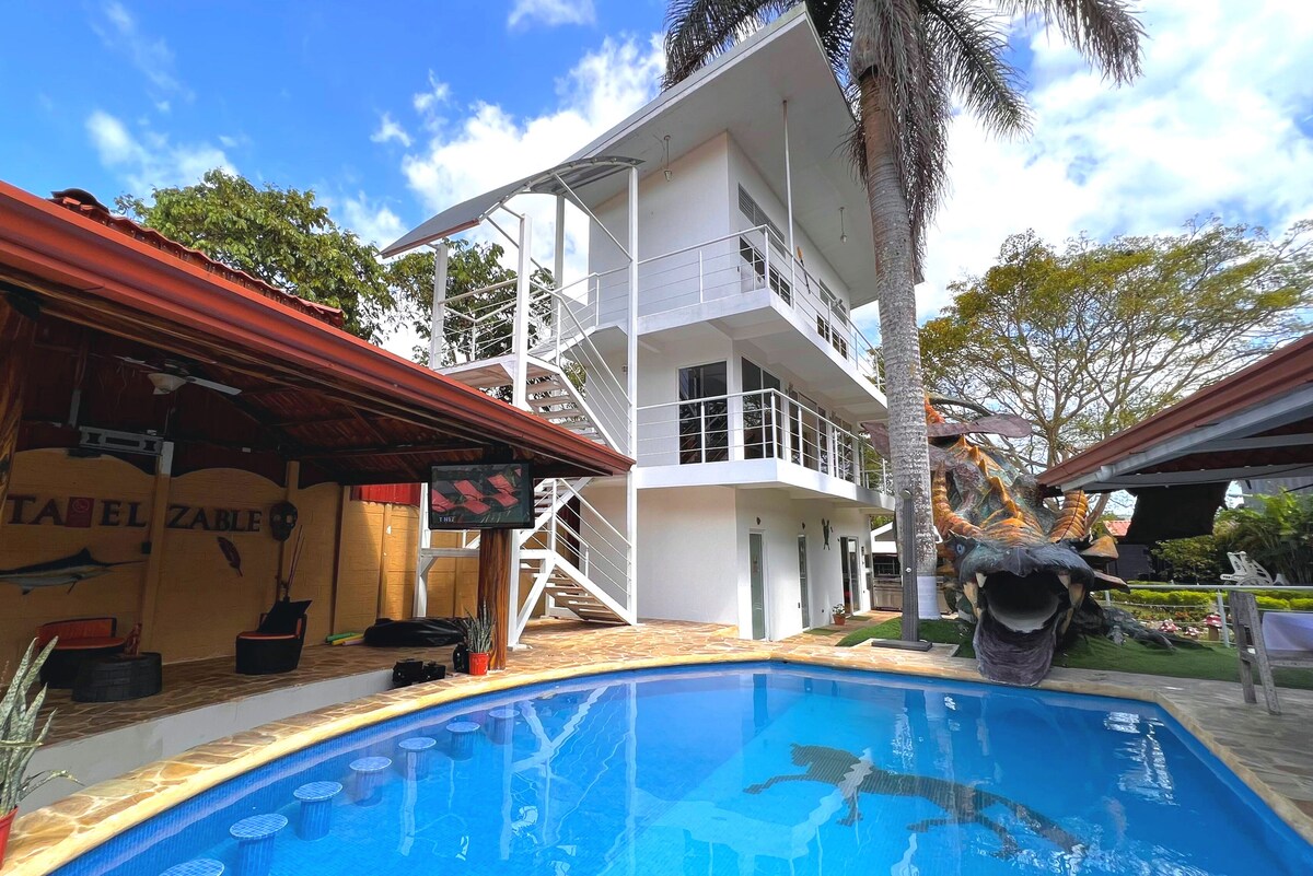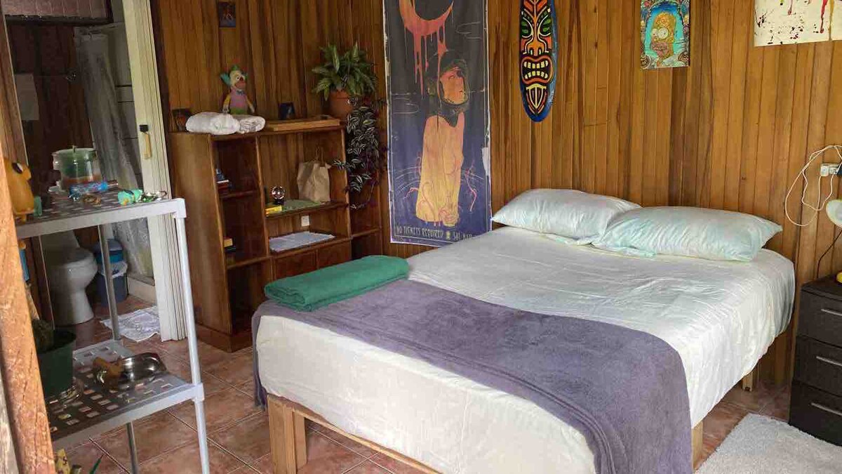 Chambre lumineuse, spacieuse et confortable avec un lit King Size et une salle de bain attenante, avec de beaux objets d'art costaricains personnalisés, une grande commode, une élégante coiffeuse et une douche spacieuse et rafraîchissante. Le Wi-Fi fiable ajoute de la commodité, ce qui le rend parfait pour se détendre et rester connecté après des journées passionnantes à la plage ou remplies d'aventure. Votre retraite confortable et accueillante pour vraiment vous détendre et terminer la journée avec style et confort ! Profitez de la cuisine complète partagée, du salon, du coin repas, du jardin tropical extérieur et de la piscine !