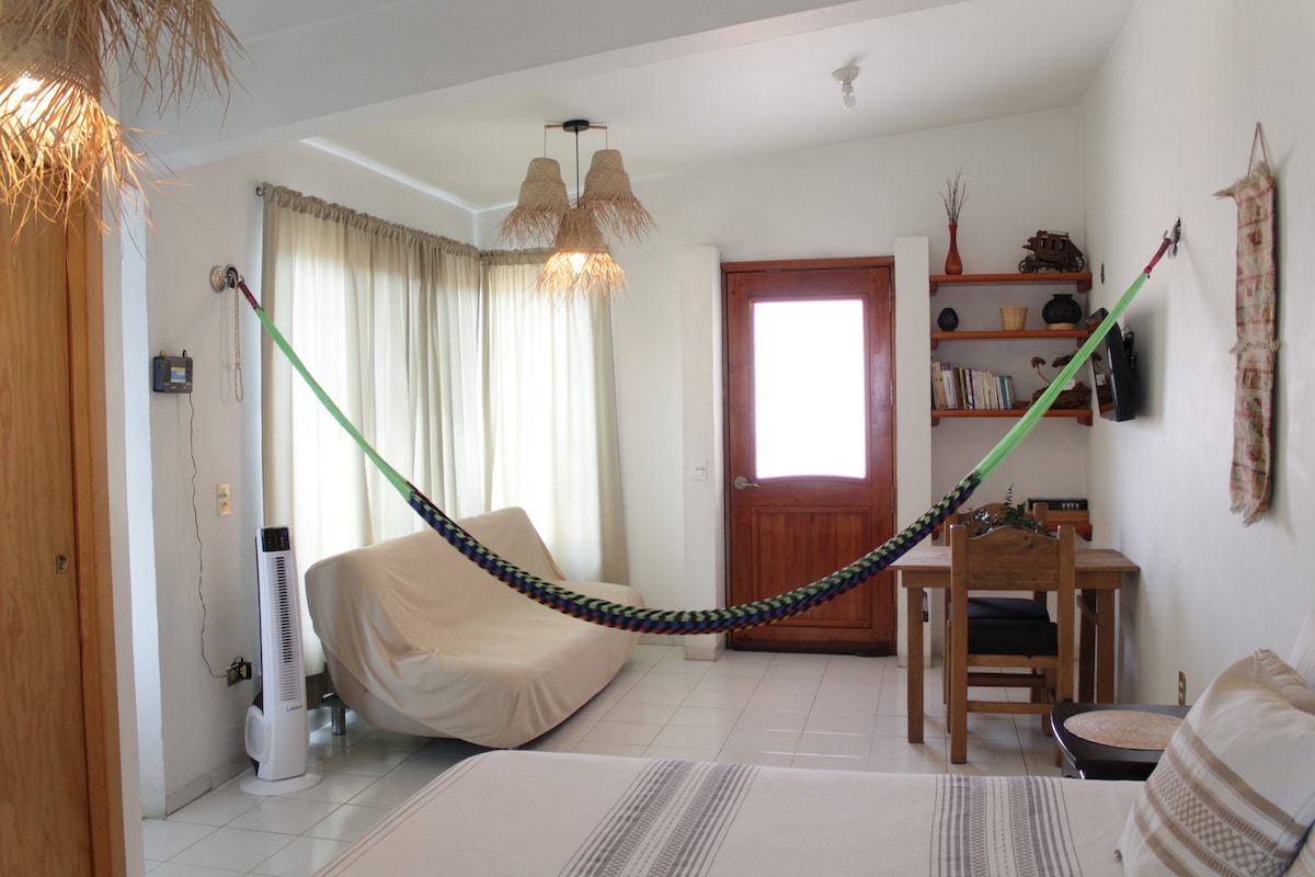 Bungalow confortable situé dans le pueblo calme et sécurisé de Lachigolo. Détendez-vous à l'extérieur dans le hamac ou profitez des vents de travers de l'espace ouvert. Parfait pour un séjour en solo ou pour un couple à la recherche de paix et de détente entre les excursions sur les sites le long de la célèbre Ruta de Mezcal !