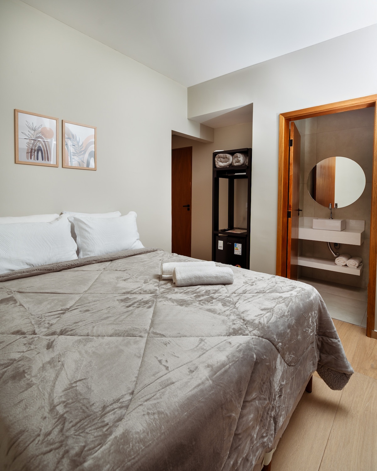 Quarto com banheiro privativo, possui 1 cama de casal e 1 cama de solteiro.