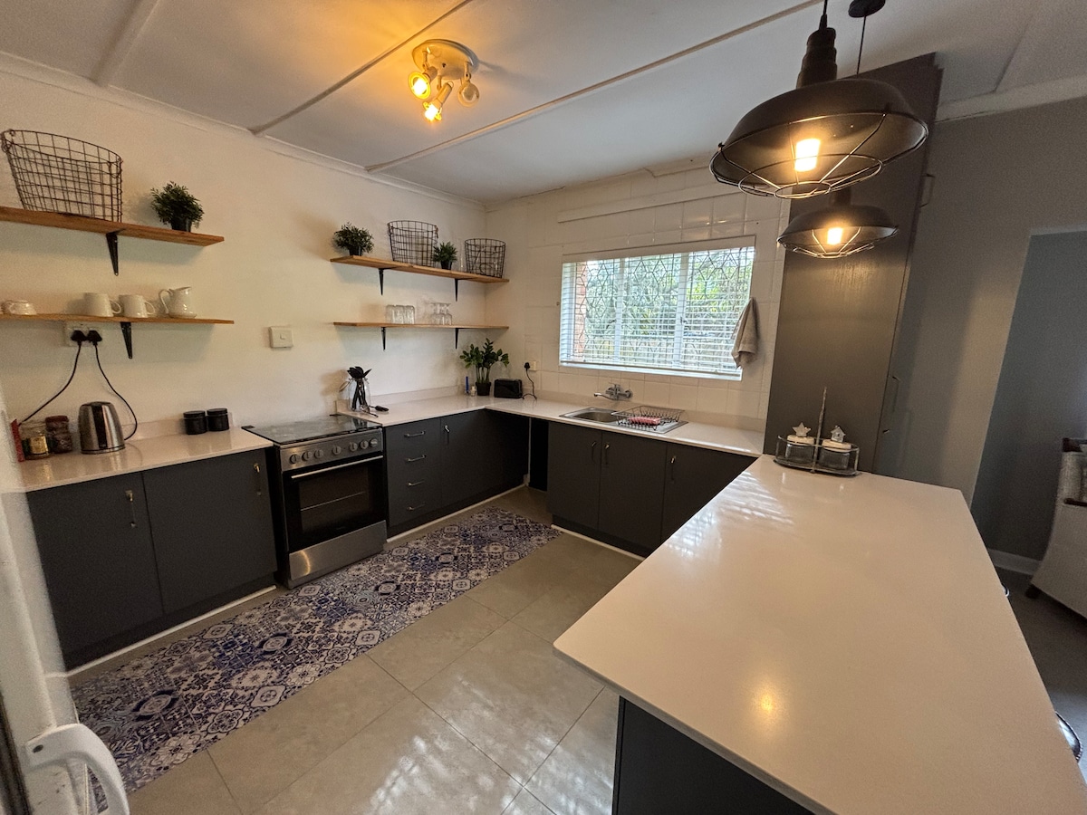 À l'étage sur l'île de Thesen, il est bien équipé pour le délestage /les coupures de courant. Il offre une maison gracieuse loin de chez vous avec une vue sur l'eau jusqu'aux têtes de knysna. Deux chambres luxueuses avec une salle de bain. Il y a une baignoire et un lavabo supplémentaires dans la chambre principale. Il est situé sur l'eau avec une jetée privée et des kayaks sont disponibles.