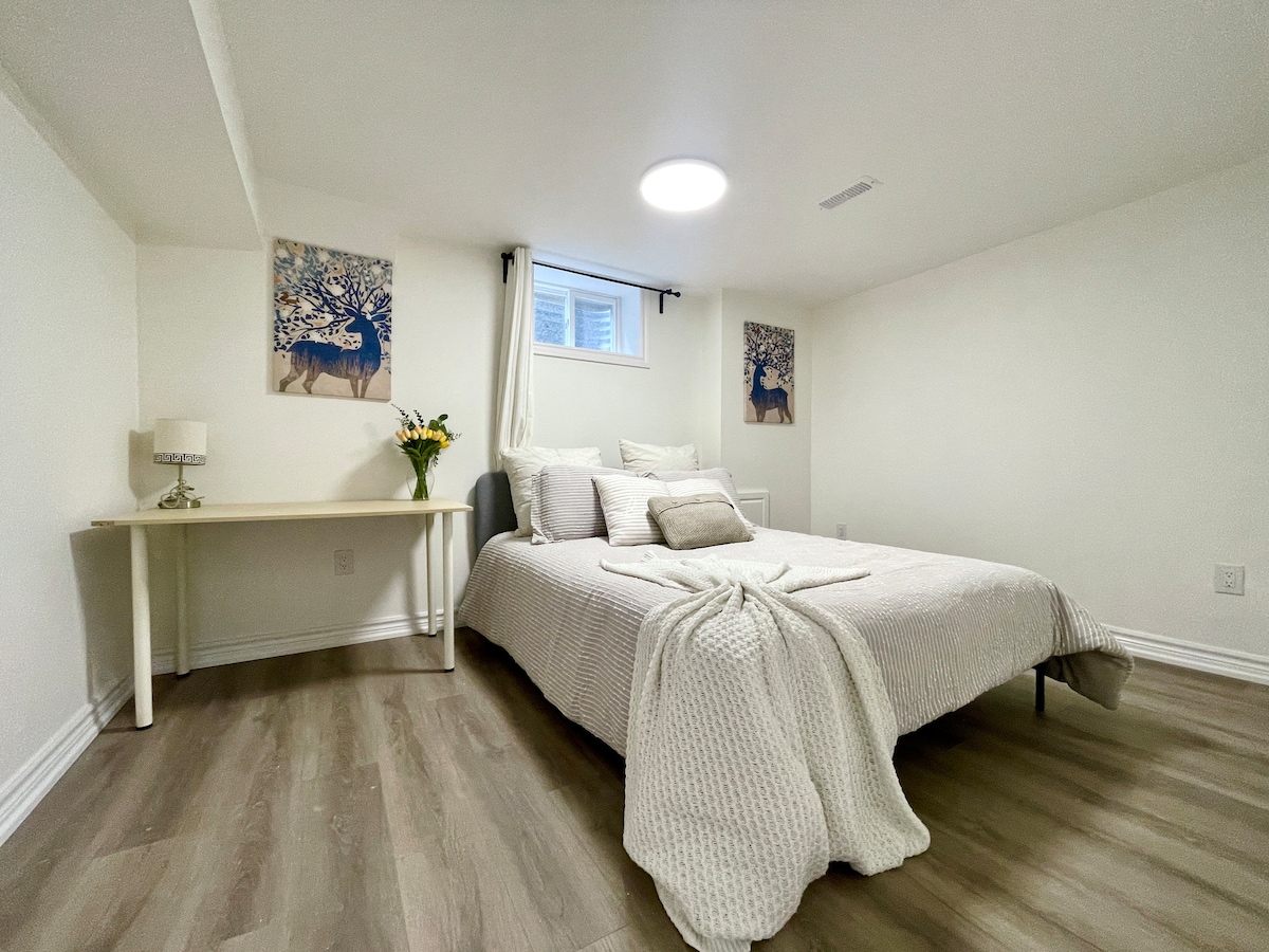 Pas de réservation par un tiers ! Pas de fêtes ! Pas de visiteurs ! ARRIVÉE SANS VOYAGEUR SUPPLÉMENTAIRE SERA FACTURÉ EN DOUBLE ! Les fumeurs ne sont pas les bienvenus ! Sous-sol lumineux et confortable 1 chambre 1 salle de bain, parfait pour passer un séjour agréable. Profitez d'une connexion Wi-Fi haut débit de 1 Gbit/s, d'un lit queen-size confortable et d'un espace de rangement. Un salon privé avec une télévision Google de 43 pouces. Un espace de travail équipé d'un bureau, d'une lampe et d'un tableau blanc, ainsi que de touches bien pensées comme un ventilateur et des éléments essentiels sur le bureau.