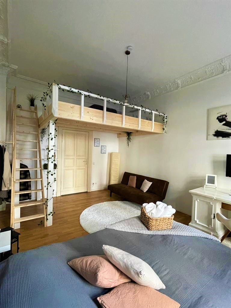 Le logement est conçu artistiquement selon ses propres idées. Il est situé dans notre maison individuelle au 1er étage. Il dispose de sa propre entrée par un escalier extérieur en colimaçon. L'environnement est très vert et calme. Dans les environs à pied se trouvent de nombreux supermarchés, restaurants et cafés. La station de métro Kurt Schumacher Platz est à 400 mètres. Avec le U 6, vous êtes en 20 minutes dans le centre-ville.