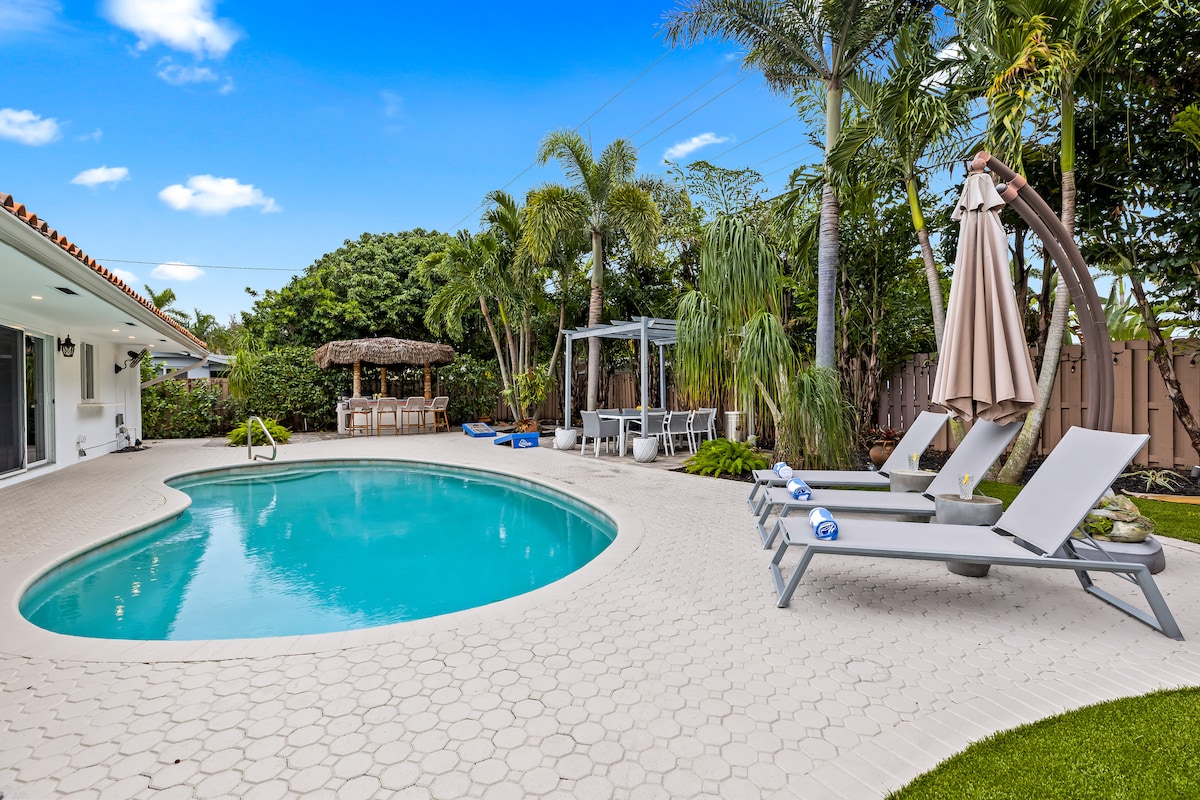 À seulement 5 minutes de la plage, notre villa moderne de 3 chambres sur Pine Ave offre l'escapade de vacances parfaite ! Profitez de votre séjour dans un espace extérieur privé avec piscine chauffée, sièges confortables et tout ce dont vous avez besoin pour vous détendre. Nous fournissons également du matériel de plage, afin que vous soyez prêt à aller sur le sable à tout moment. Situé à seulement 3 minutes du centre commercial Sea Ranch, avec Publix, First Watch, Dunkin', CVS, FedEx et plus encore. Envie de vous amuser et de profiter de la vie nocturne ? Commercial Blvd se trouve à seulement 10 minutes à pied ! PAS BESOIN DE VOITURE !
