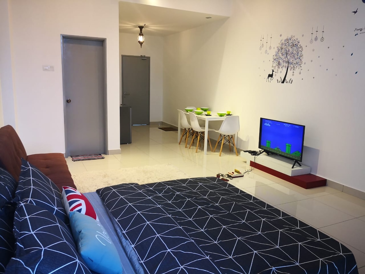 Détendez-vous avec toute la famille - Studio super spacieux de 2 chambres - Procédure d'arrivée rapide et facile - Wi-Fi haut débit de 100 Mbps - Télévision connectée (peut être reliée à Chrome ou mise en miroir avec votre smartphone.) - Serviettes, draps et matelas de qualité - 1 place de parking gratuite - Sécurité 24h/24 - Accès gratuit à la piscine, à la salle de sport et au jardin sur le toit - À seulement 20 minutes de KLCC - À 10 minutes de Sunway Pyramid - À 6 minutes du centre commercial Paradigm, de Tesco et de l'hypermarché Giant. - 中文房东dans cet hébergement paisible.