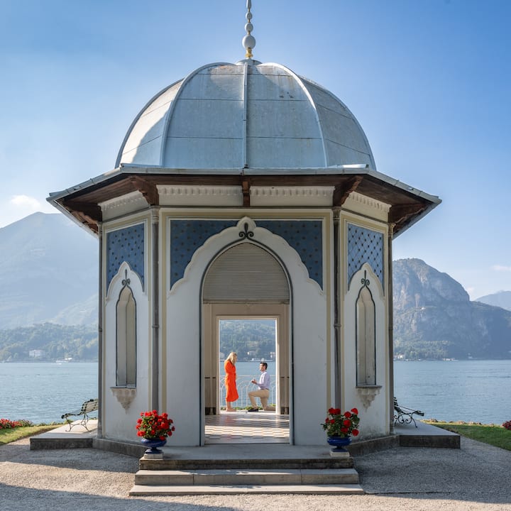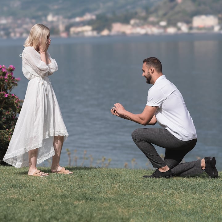 Une séance photo de demande en mariage avec le lac de Côme en toile de fond. Le délai de livraison est de 7 jours ouvrés et comprend 25 photos haute résolution retouchées avec 2 ans de sauvegarde.