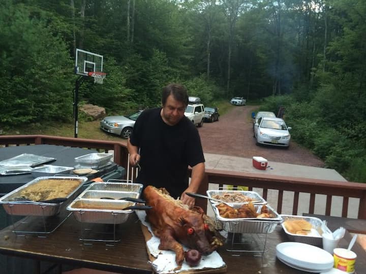 Notre rôti de porc Pocono comprend un cochon de lait de 50 livres, du poulet frit Pocono, de la saucisse de porc et de la farce aux pommes. Les accompagnements comprennent du porc, du barbecue et des sauces Carolina, du maïs en épi, de la salade de chou et du pain de maïs avec du beurre au miel.