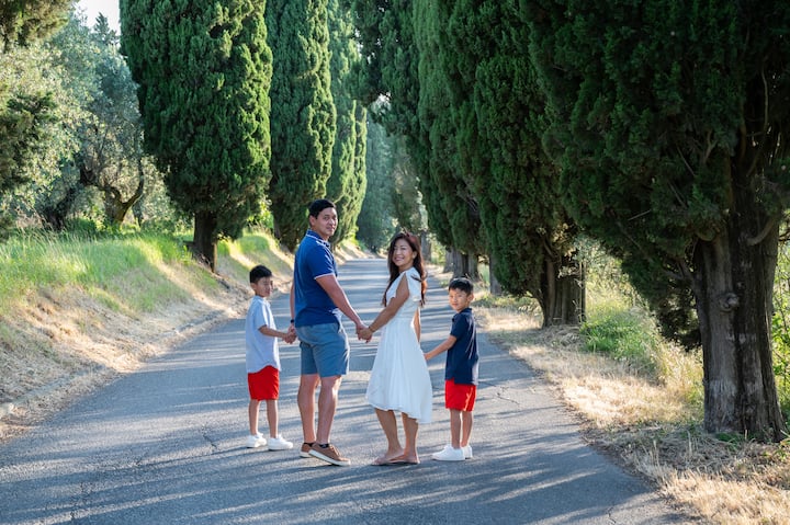 Nous nous retrouverons au milieu des douces collines verdoyantes, à San Casciano, non loin de Florence, dans un cadre enchanteur, entouré d’oliveraies et de cyprès séculaires, avec des vues à couper le souffle sur la campagne qui rendent chaque prise de vue unique. Le prix comprend la post-production. Dans les 3 jours, je vous enverrai les photos jpeg en haute résolution via wetransfer.