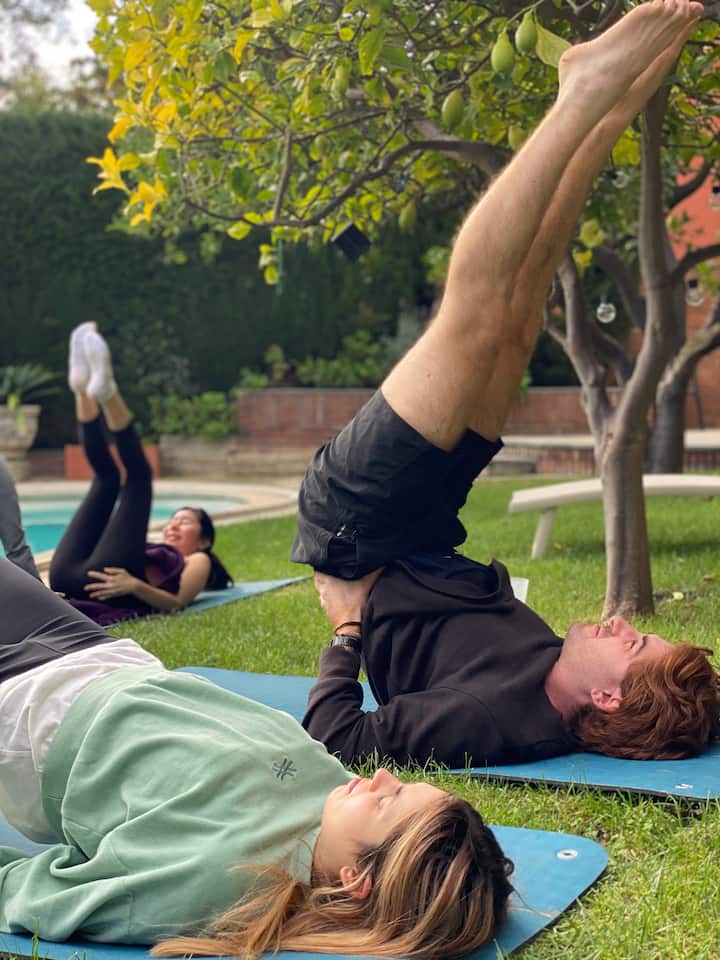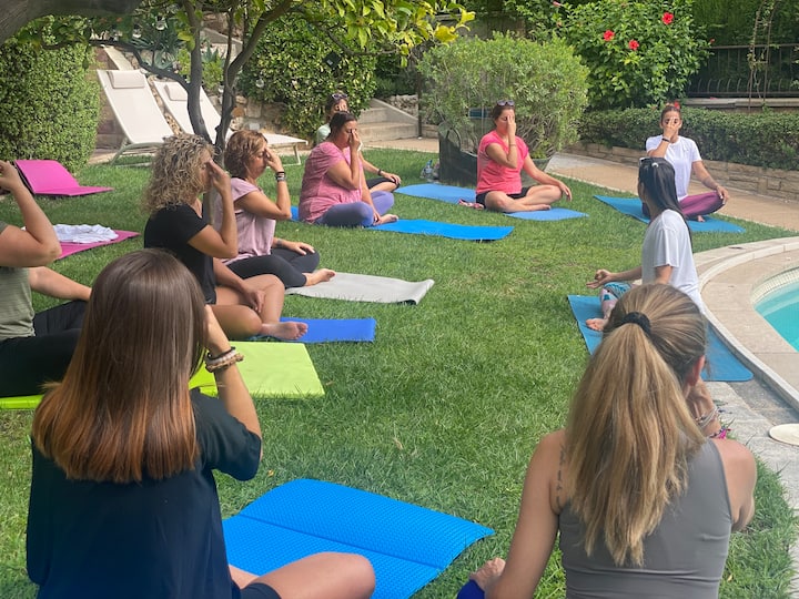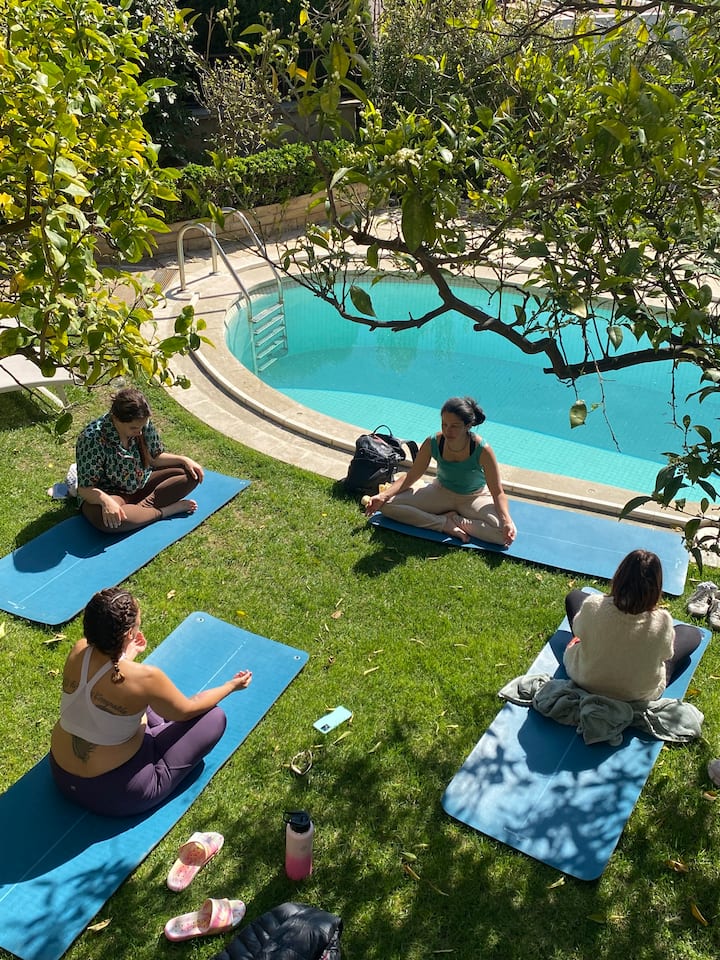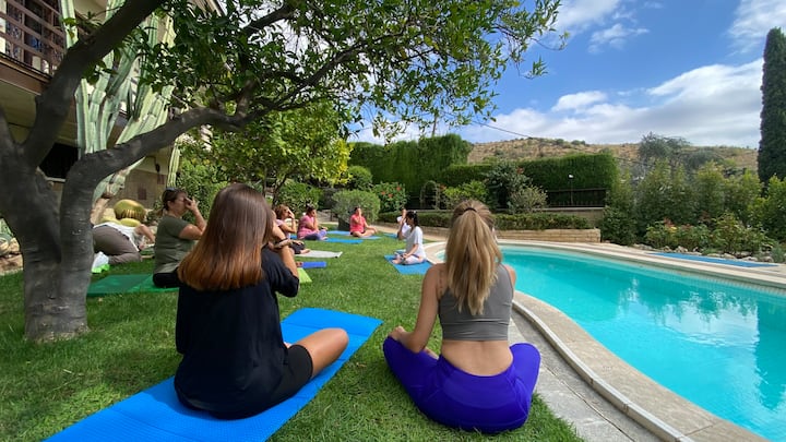 Séance de yoga dans un jardin entouré par la nature. Comprend l'option piscine et rafraîchissement.