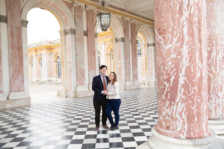 Conseils pour prendre des poses confortables lors de la visite de différents lieux parisiens ou de Versailles. Livraison de 30 photos en couleur et en noir et blanc via la galerie Joomeo.