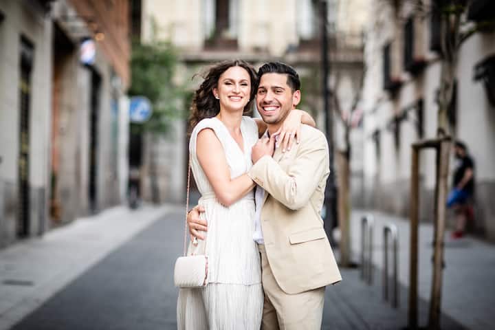 Belles photos de couple, posées et naturelles, dans le centre de Madrid.