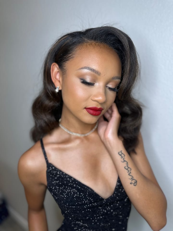 Cette séance comprend la coiffure et le maquillage avec des faux-cils.