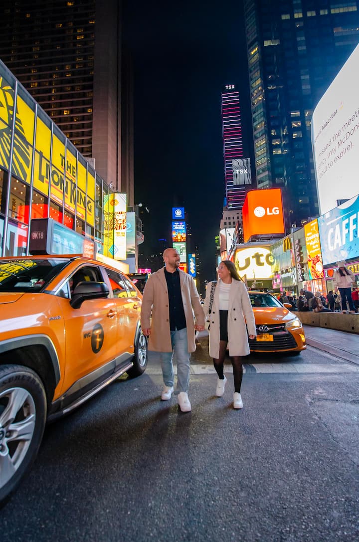 Cette séance d'une heure dans les rues incroyables de Times Square sera particulièrement belle la nuit. C'est une excellente idée de cadeau de fiançailles, d'activité EVJF ou de portrait de famille mémorable. 10 à 20 images retouchées dans une galerie en ligne.