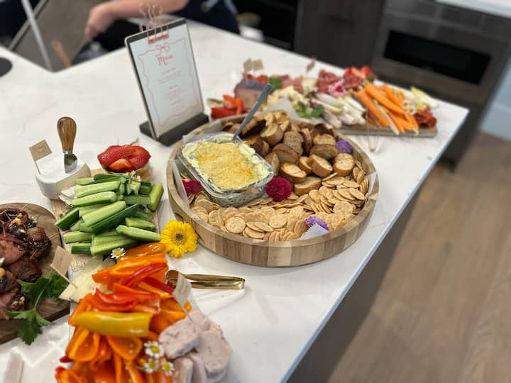 Offrez à votre groupe une planche de charcuterie magnifiquement organisée et conçue par un chef : la pièce maîtresse idéale pour vos vacances, votre soirée vin ou votre célébration spéciale. Avec des viandes gastronomiques, des fromages artisanaux, des fruits frais, des noix, des dips et des touches personnalisées, ce plateau est aussi époustouflant que délicieux. Créé par le chef Casey, à partir d'ingrédients de saison de haute qualité.