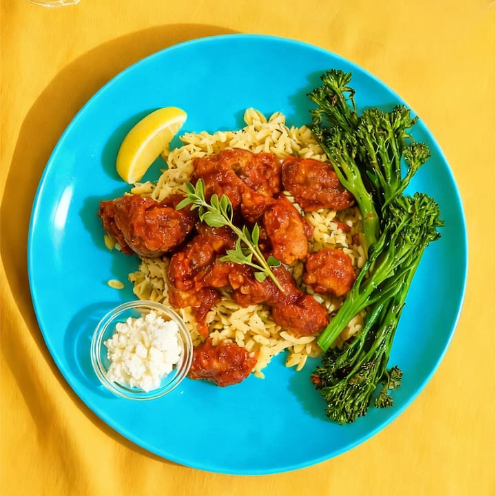 4 plats. Poulet braisé lentement avec des tomates, de la cannelle et de l'origan, servi avec de l'orzo au citron, du broccolini à l'ail et de la feta émiettée. Une interprétation vibrante et aromatique du confort méditerranéen. Comprend 4 repas méditerranéens à base de poulet.