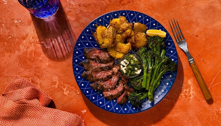 4 plats. Bavette de flanchet grillée frottée aux épices basques aux agrumes, servie avec des pommes de terre écrasées à l'ail, du broccolini fumé et une salsa verte à la feta et aux asperges. Audacieux et lumineux jusqu'à la dernière goutte de citron. Comprend 4 repas de steak aux épices basques.