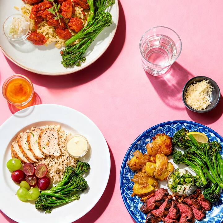 3 plats. Savourez un voyage gustatif de Napa à la Méditerranée, avec du poulet de la récolte (poulet rôti farci au fromage de chèvre, sur un pilaf de riz brun, garni de raisins juteux et de salsa balsamique aux pignons), du steak grillé aux épices basques (hampe de bœuf grillée avec salsa verte à la feta et aux asperges, écrasé de pommes de terre au parmesan et broccolini) et du poulet braisé à la méditerranéenne (poulet braisé à la cannelle avec orzo au citron, broccolini grillé et feta émiettée). Comprend 1 de chaque repas.