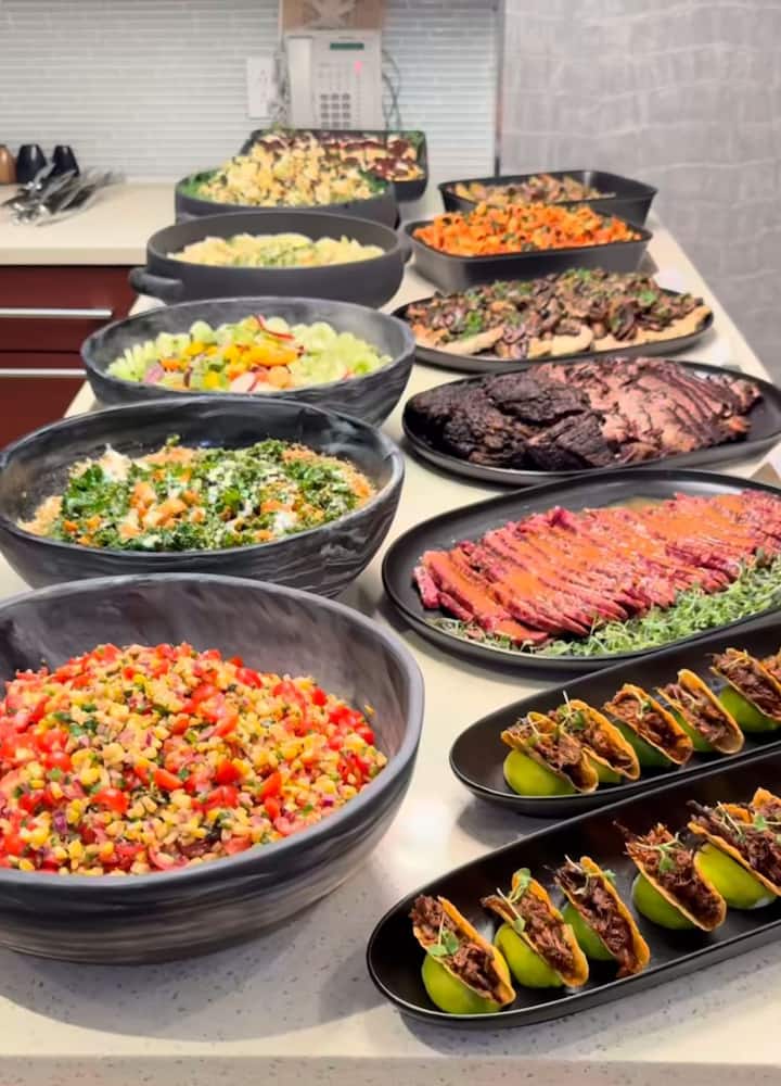 Notre duo de chefs propose des repas magnifiquement préparés, notamment pour le petit-déjeuner, le déjeuner et le dîner. Ces services comprennent le service à l’assiette, le service à la familiale, les fêtes autour de pâtisseries, les fêtes autour de canapés, les barbecues et les cours de cuisine.