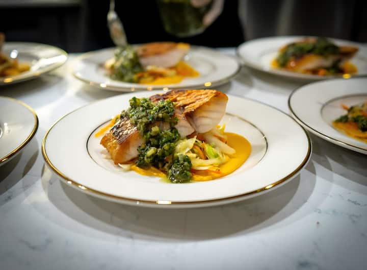 Expérience en 5 services. Profitez d’une expérience en 5 services soigneusement conçue, comprenant du champagne et des canapés, des entrées, un plat principal, un dessert et un plateau de fromages. Chaque plat est préparé avec soin pour ravir vos sens et créer une expérience culinaire inoubliable et élégante.