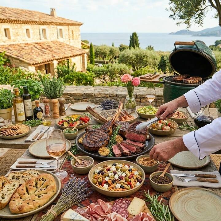 Barbecue sur mesure composé de grillades, accompagnements & dessert. Grillades (~3 belles pièces/pers) : Pièces de viandes grillées, brochettes marinées maison, saucisses artisanales, pêche du jour, etc. Accompagnements : Salades composées, légumes grillés, grenailles au romarin, etc. Dessert : Douceurs estivales.