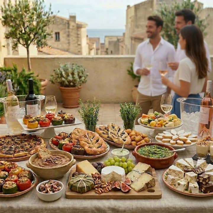 Voyage en 5 temps : Amuse-bouche, Mise en bouche, Entrée, Plat, Dessert. Vous retrouverez les inconditionnels de la gastronomie locale au fil des saisons : Soupe de poisson, Panisses, Tapenade, Poulpe, Loup de mer, Aïoli, Soupe au pistou, Agneau de Sisteron, etc. La sélection sera à définir ensemble suivant vos envies.