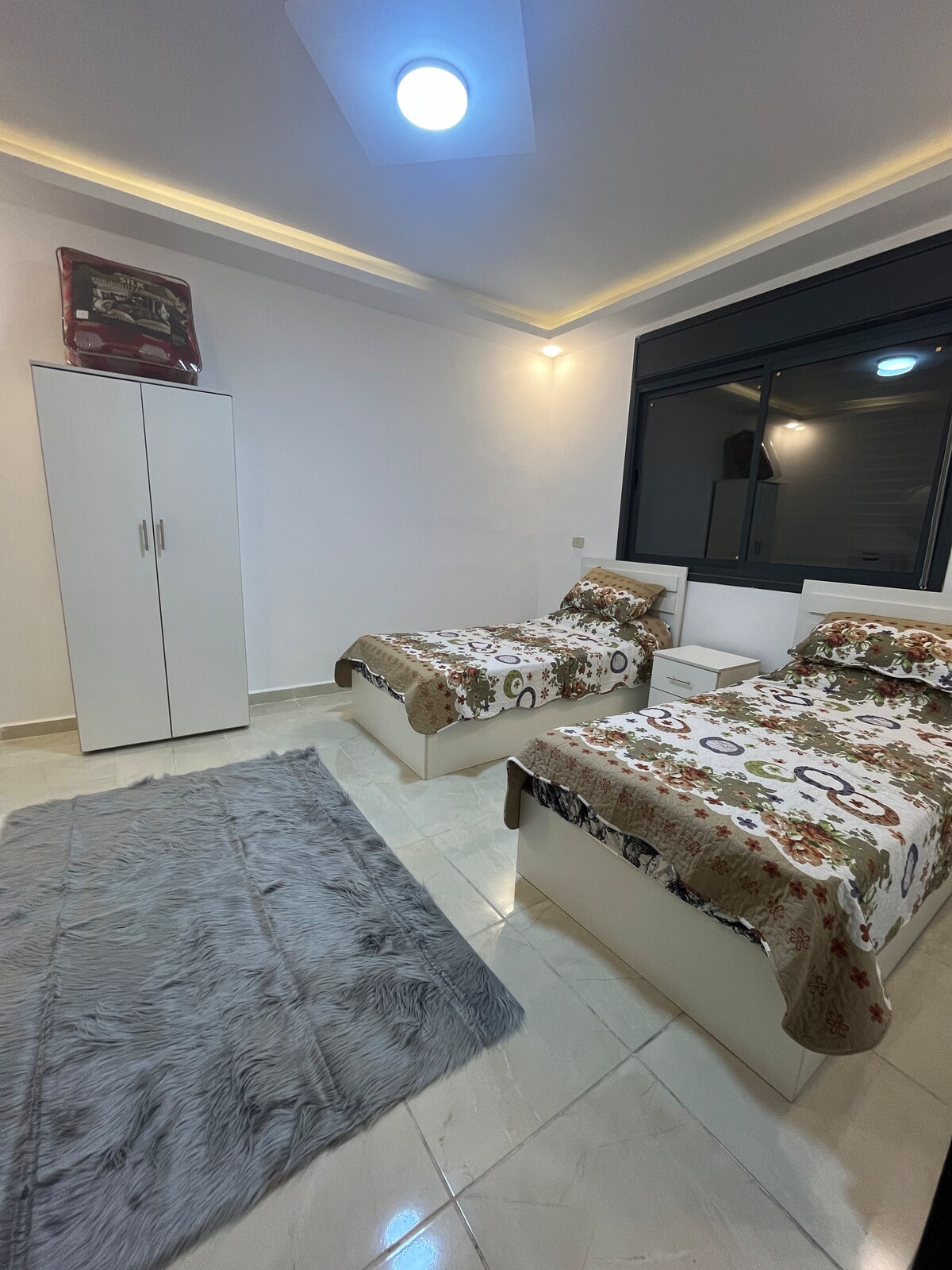 Profitez en famille de ce fabuleux logement qui offre de bons moments en perspective. Situé en plein centre d'Irbid AL Hay Al Sharqi. Appartement privé moderne entièrement meublé. Entièrement équipé avec appareils électroménagers, climatisation, chauffage, eau chaude, lave-linge, cuisinière et réfrigérateur. Au 3e étage avec ascenseur et vue dégagée sur la ville. Accueille une grande famille. 3 chambres avec 1 lit Queen Size, 1 lit double et 2 lits simples. Locations à court ou long terme disponibles.