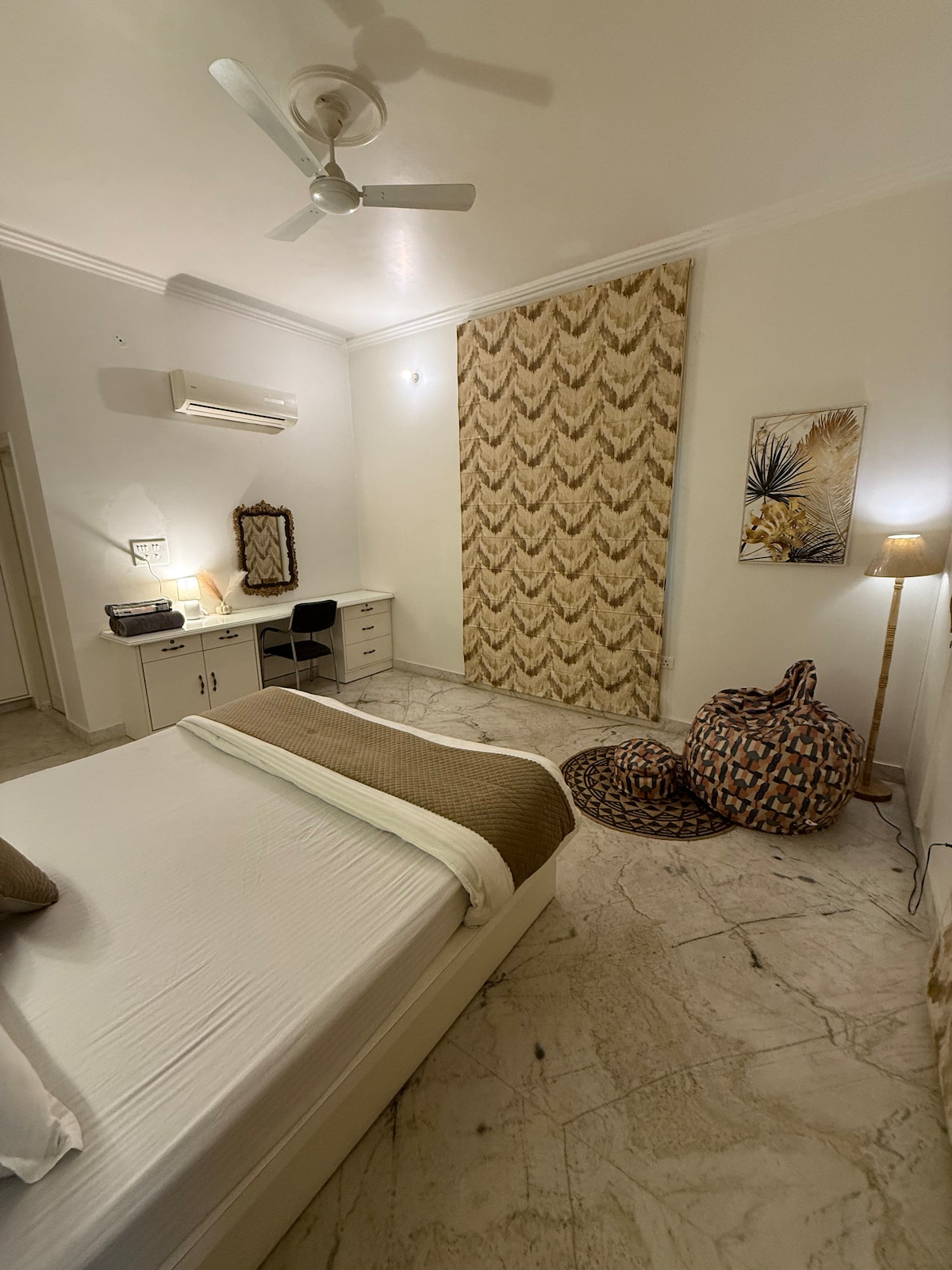 This elegant 2-bedroom villa is situated in the highly desirable Nemi Sagar Colony of Vaishali Nagar, Jaipur. Featuring premium furnishings, a fully equipped kitchen, a private bathroom with a modern shower, and an elevated Jacuzzi designed for two, it offers a blend of comfort and luxury. High-speed internet is available, and the villa is just a walk from some of the city’s finest restaurants, cafes, and shops, making it the ideal choice for those who value both convenience and sophistication.