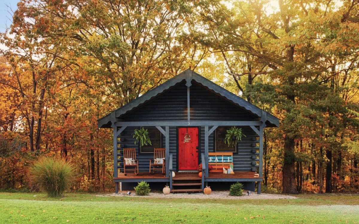 Cabane d'Ozark avec un fantastique porche dans les arbres