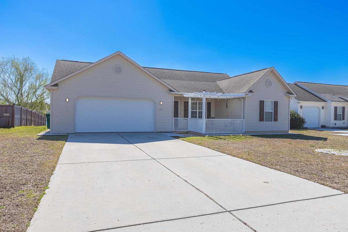 Venez séjourner dans notre maison idéalement située à 4 miles en voiture de l'accès à la plage publique. Nous sommes assez proches pour visiter la plage tous les jours, mais hors des sentiers battus pour être une escapade tranquille pour vous et votre famille. Située entre Surfside et Myrtle, notre maison est située dans un quartier familial à proximité d'une variété de restaurants et d'attractions. Motos et animaux acceptés, nous espérons que cela peut être une « maison loin de chez vous » pour votre séjour de vacances en famille. Cages pour chiens de grande et moyenne taille disponibles.