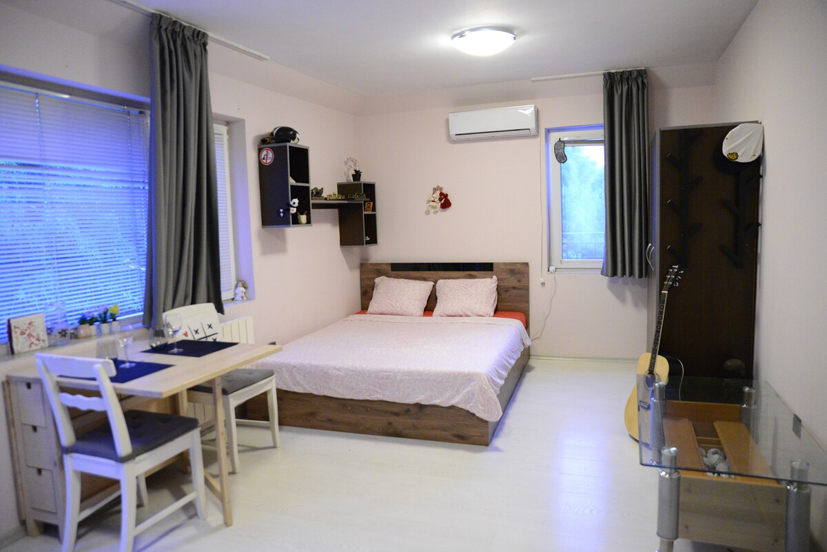 Appartement spacieux avec cuisine ouverte, salle à manger et salon ; une chambre avec un lit king size et un bureau ; deux toilettes et une douche. Le canapé du salon est pliable et peut accueillir jusqu'à 2 personnes. L'appartement est très proche de l'un des plus beaux parcs de Sofia. Il dispose d'une connexion facile avec le centre-ville. Il y a un grand supermarché de l'autre côté de la rue.