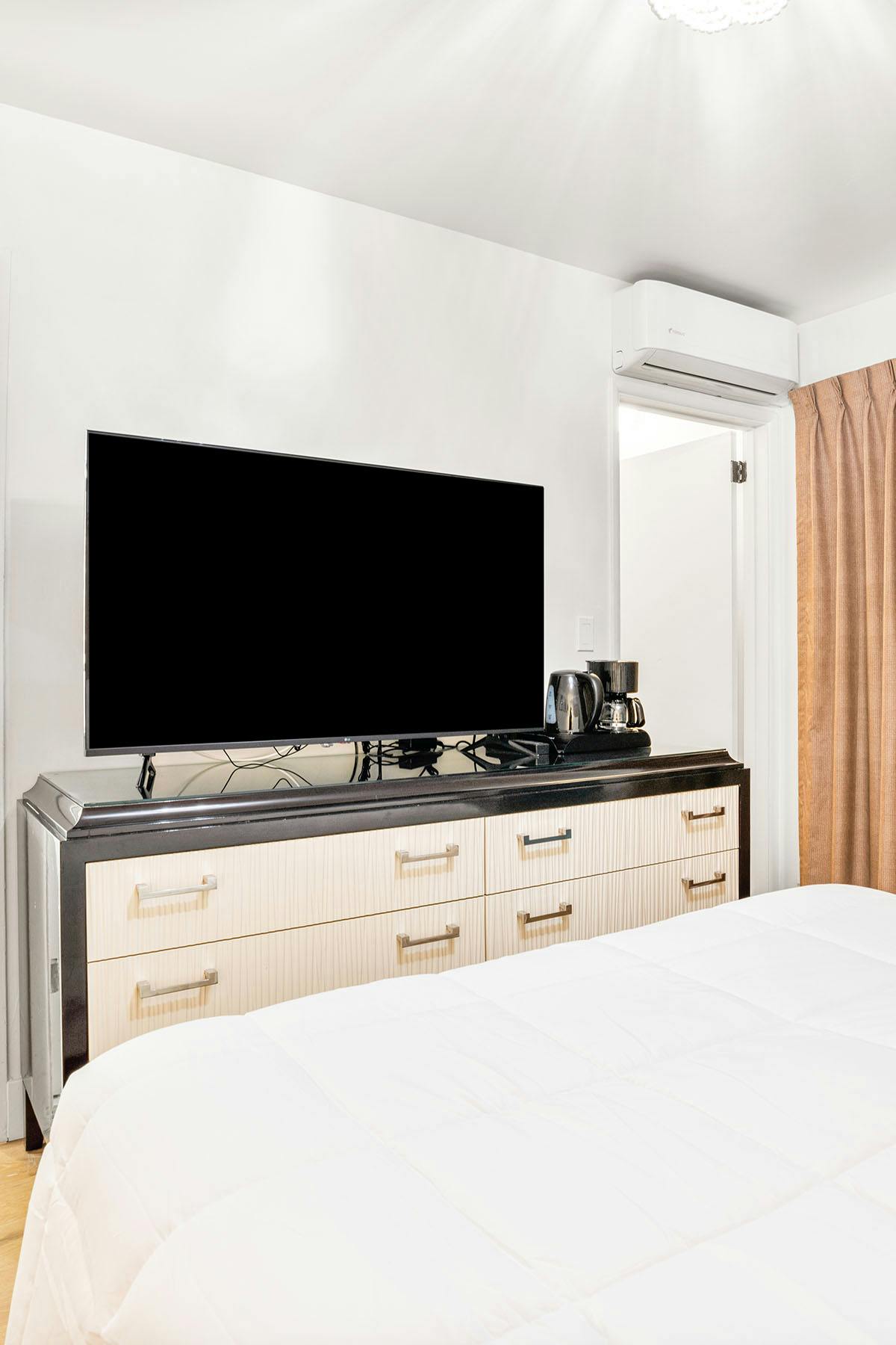 Avec des tonnes de confort et encore plus de confort, notre Hygge Queen vous aidera à voyager léger et à dormir tranquillement. C'est pratique, la cafetière MIXPRESSO rend votre première tasse de la journée incroyablement facile à trouver. Son mini-réfrigérateur simplifie les collations dans la chambre. Et ses produits de bain Malin + Goetz rendent les longues douches encore plus luxueuses. Avec une connexion Wi-Fi gratuite, vous n'aurez jamais de mal à rester connecté. Et avec le chauffage et la climatisation, vous n'aurez jamais de difficulté à contrôler le climat de la pièce.