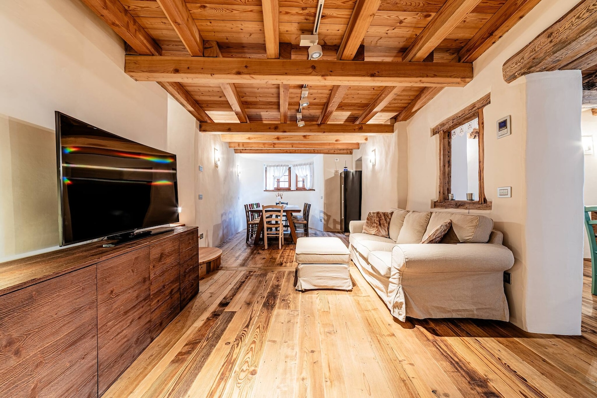 Mansarde nouvellement rénovée. Espace ouvert en bois naturel couronné par onze grandes fenêtres de toit. Assis confortablement sur le canapé, vous pouvez admirer les forêts, les rochers et les étoiles. La mansarde a été entièrement rénovée avec des matériaux précieux et équipée de nombreux gadgets intelligents. L'appartement est situé dans un quartier résidentiel calme, ensoleillé et panoramique au cœur du Val di Fassa, près de la forêt, à 3 km du principal quartier commerçant et des remontées mécaniques de Sellaronda. CIN : IT022113C2RUCHO5AY
