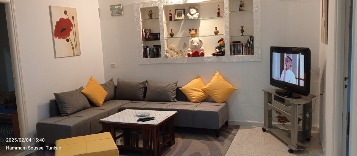 Profitez d'un logement élégant et central. Un environnement familial dans une résidence sécurisé. Avec une place parking privé sécurisé gratuit. Deux chambres avec un grand lit double pour plus de confort et deux lits séparée. Un appartement au cœur d'un des grand quartier de Sousse, tout est à proximité à pied ! à une minute max (à pied) à la résidence, des restaurants, Café, banques, Boulangerie, magasin... Hè! pas de coupue d'eau contrairement à toute la région grace la bâche à eau installé