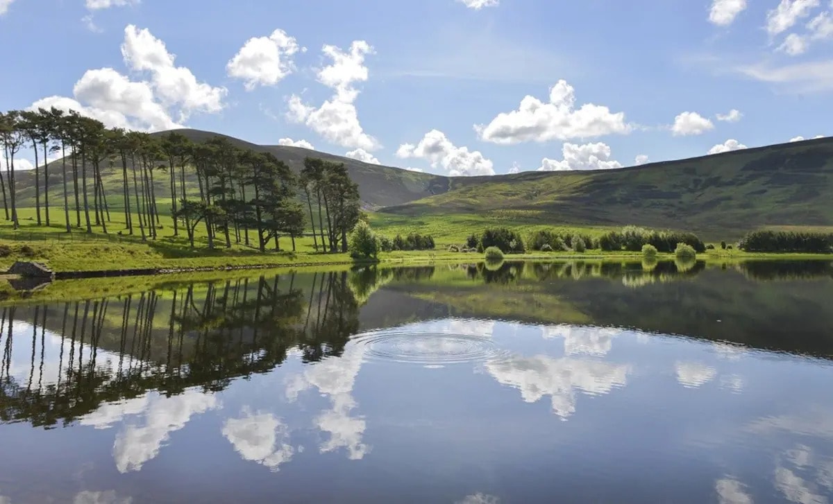 Chalet rural, vue sur la colline et le lac près d'Édimbourg