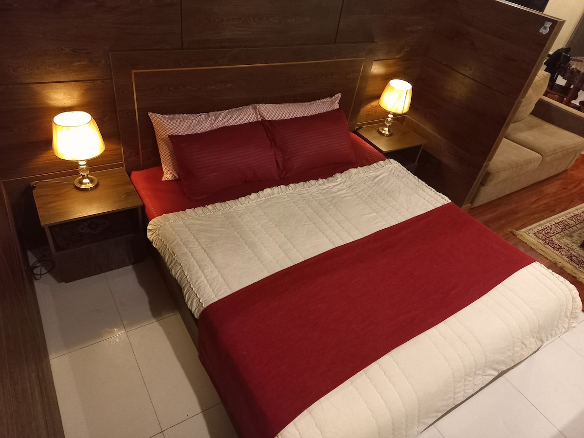 Bienvenue dans mon appartement de luxe de 2 chambres au décor paisible, élégant et minimaliste. Il est situé en plein cœur de Lahore avec tous les équipements nécessaires à l'intérieur. ---- Wi-Fi haut débit gratuit Alimentation électrique de secours 24h/24 et 7j/7 sur générateur automatique Eau chaude instantanée Salon élégamment décoré Les deux chambres disposent d'une terrasse avec une vue magnifique. 3 onduleurs idéaux pour l'été et l'hiver Télévision connectée Samsung 55 pouces à commande vocale (Prime Video, Youtube, etc.) Four à micro-ondes Réfrigérateur Support pour fer à repasser