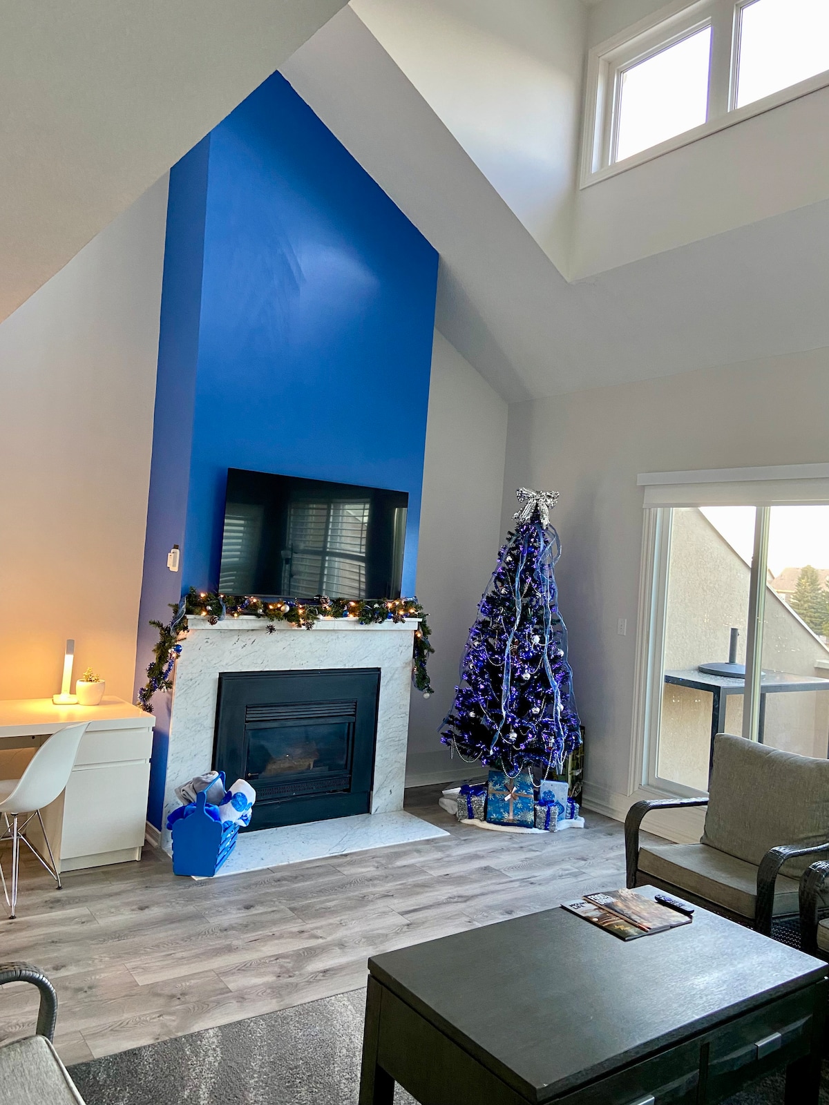 Nous sommes décorés de manière festive pour les fêtes. Barbecue disponible toute l'année. Le chauffage du sauna pour 2 personnes est tout neuf ! Pour arriver à 7, 1 personne est sur le nouveau futon dans le salon. Nous fournissons la literie. Bienvenue dans votre escapade à Blue Mountain Village !Profitez de deux balcons au deuxième étage avec une vue imprenable sur les pistes/le parcours de golf de Monterra. Le village de Blue Mtn est à quelques pas. Beaucoup de place pour créer des souvenirs en famille, séjour d'affaires, séjour, escapades entre filles/garçons, compétitions de danse, profiter de la randonnée pédestre/vélo sur les sentiers