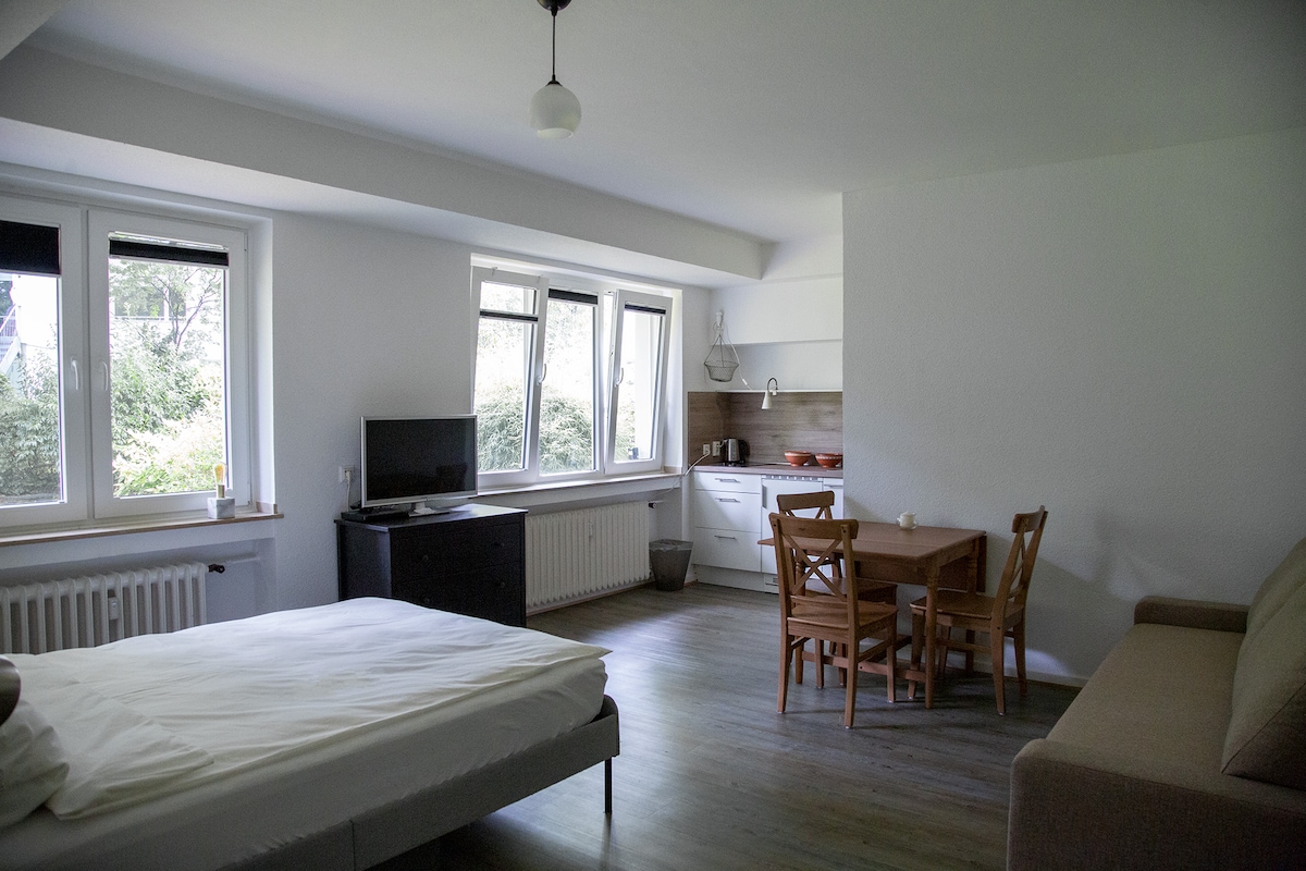 L'appartement est situé directement sur le Rhin à Oberkassel sur le côté calme et frais du jardin. Il est entièrement équipé pour les longs séjours et meublé avec de l'art et des meubles de haute qualité. La nouvelle salle de bain luxueuse dispose d'une douche de pluie de plain-pied et la cuisine séparée dispose d'une salle à manger pour 4 personnes. Le salon/chambre combiné dispose d'un lit double, d'un canapé-lit, d'un lit bébé, d'un grand placard, d'un bureau, d'une télévision intelligente et d'une chaîne stéréo. Il est possible de se garer gratuitement, station de recharge électrique à 50 m.