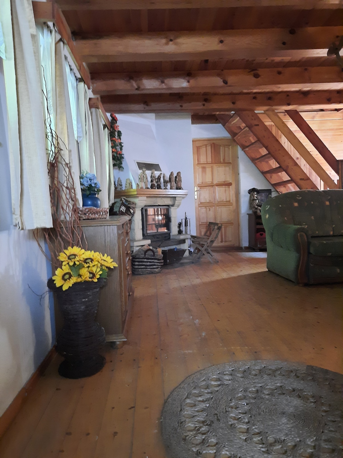 Je propose une maisonnette en bois confortable. L'avantage de la maison est l'espace, la terrasse en pierre et l'endroit pour faire un feu et un barbecue. Cette maison de campagne unique a une atmosphère unique et est décorée avec amour, vous pouvez vous sentir comme chez vous. En bas, il y a un petit salon avec un canapé confortable où vous pouvez vous détendre, lire, regarder la télévision (bibliothèque disponible) Dans le salon, il y a un coffre en bois dans lequel se trouvent un tapis de yoga, des ceintures, des blocs et des couvertures.