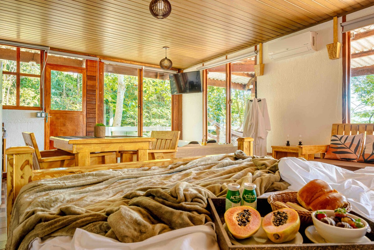 Chalet exclusif pour les couples construit au milieu de la nature, sur une belle plage réservée connue sous le nom de Praia Branca/Guarujá. L'accès au site se fait uniquement par bateau ou par sentier, parfait pour ceux qui veulent entrer en contact avec la nature et se détendre. Notre tarif journalier comprend un délicieux petit déjeuner et le chalet est équipé de : climatisation, TV Sky, minibar, salle de bains privative, linge de lit et véranda avec vue sur la forêt atlantique. Tout cela à 150 m de la mer.