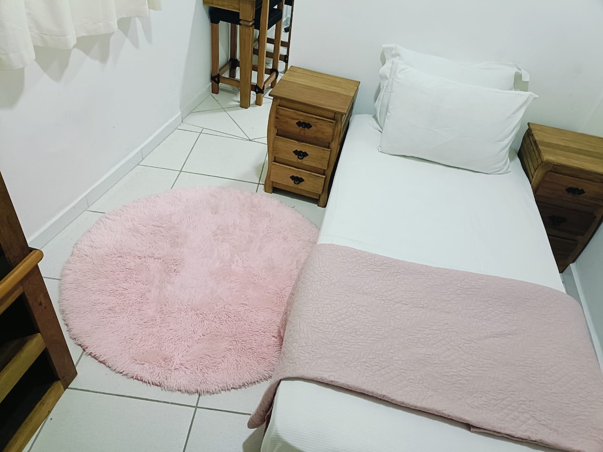 Maison d'hôtes d'une superficie de 40 m² et tout le nécessaire dont vous avez besoin pour passer un excellent séjour. Grande chambre avec lit double, table de chevet, penderie et télévision numérique intelligente ; salle de bain complète avec douche électrique ; cuisine avec cuisinière électrique 1 bouche , four à micro-ondes et ustensiles ; chambre de type américain où vous pouvez utiliser pour vos repas et même pour le travail. Il n'y a pas de garage. Nous sommes à 1,4 km de l'autoroute régis bittencourt, des marchés à proximité et à 2,5 km du centre commercial Taboão.