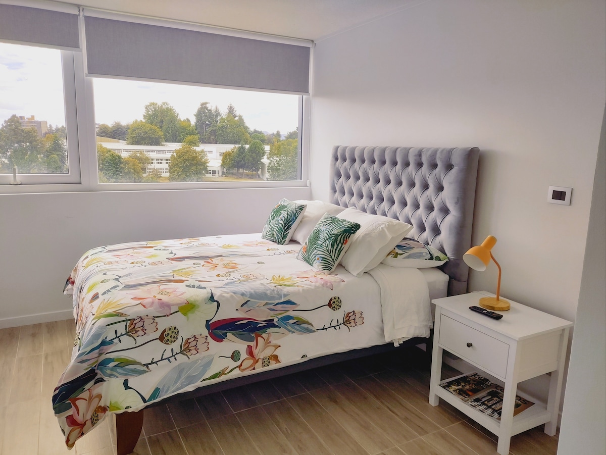 Cet appartement élégant et calme a tout ce dont vous avez besoin pour faire de votre séjour à Valdivia, le meilleur. Il dispose d'une chambre avec un lit 2 places (Smart Tv incluse, Wifi) + salle de bain privée. Une autre salle de bain, une grande cuisine entièrement équipée et un beau salon-salle à manger, avec terrasse à l'extérieur. En outre, une salle de sport équipée, piscine, quincho et salle d'événements. Et le meilleur : à seulement 5 minutes du centre de Valdivia. IMPORTANT : vous pouvez demander 2 matelas supplémentaires pour que 2 autres personnes puissent dormir.