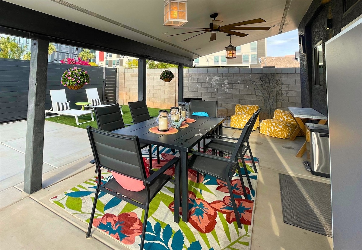 NOUVEAU* MAISON moderne éclectique rénovée 2 chambres en bas (lit King size et Queen size) + LOFT à l'étage (2 lits jumeaux) - Centre-ville de Tempe avec grand patio couvert privé et cour avec parking sécurisé. Lits King, Queen et jumeaux, HTV 65", à 3 pâtés de maisons de Mill et 1/2 mile de l'ASU. Excellent rapport qualité-prix pour une maison neuve avec une cour. Entrée d'accès à la ruelle par un beau portail automatique en fer de 7 pieds personnalisé avec parking clos. Profitez du centre-ville de Tempe et de tout ce qu'il a à offrir ! Numéro de licence : STR-1091