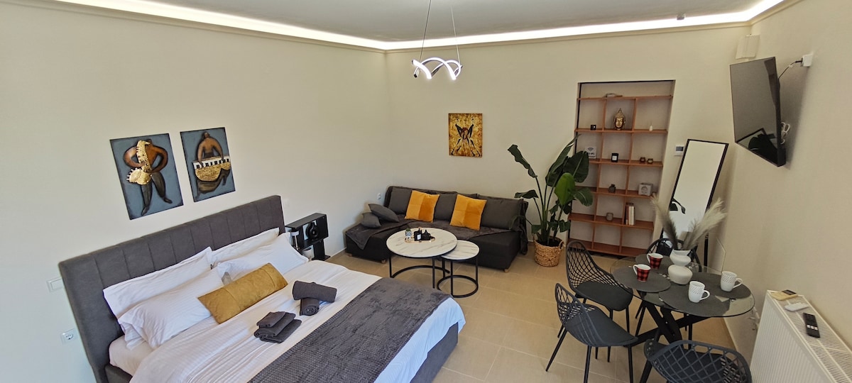 one unit guesthouse (1 bedroom) with small kitchen and all that you need :) A quite place in an isolated olive grove with amazing view of the sea. 15 min drive from the center of Volos. The best combination of nature and city. Perfect as a base for trips all around Pelion, 15 min from Volos, 25 min from Portaria & Makrinitsa, 75 min from the east side, 40 min from Afissos and more.