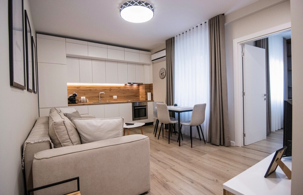 Superbe appartement au cœur de Tirana, avec une vue magnifique, un éclairage naturel et avec une terrasse spacieuse à l'étage qui vous pouvez voir la ville (la nuit le ciel est magique). Un design moderne avec une touche de chaleur du bois et des chambres spacieuses. Situé à seulement 4 minutes à pied du centre et avec connexion à toutes les rues principales de Tirana fait de cet appartement un bon choix pour les voyageurs qui veulent découvrir les attractions culturelles de la ville, les musées, les parcs, les restaurants et la vie nocturne de Tirana.