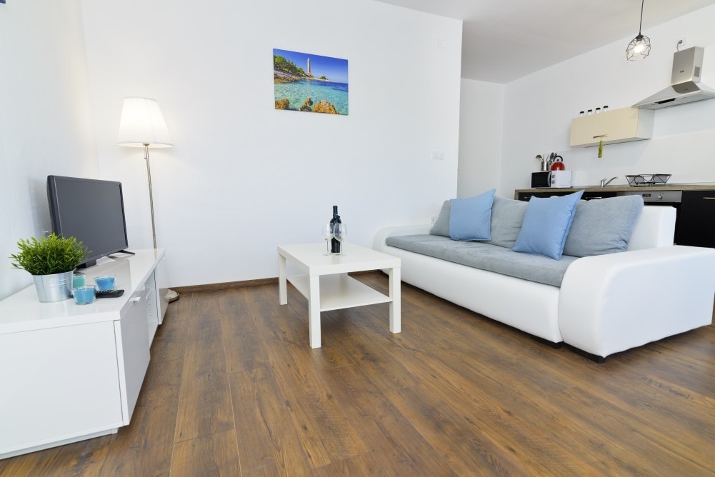 Beautiful apartment by the seaside consists of one bedroom with queen size bed, one bathroom with shower, one dinning area, kitchen and a spacious terrace with a nice view of the bay. The apartment is equipped with air conditioning unit, satellite dish, TV and Wi-Fi connection. Free parking and a possibility of free mooring for the boats is available per request as well as laundry washing facilities. Pets are allowed (no extra charges). For any additional requests, we stand at your disposal.